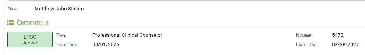 As of 01.12.2026, Dr. Stiehm has completed his Direct and In-direct contact hours as required by the Minnesota Board of Behavioral Health. Dr. Stiehm has completed all his requirements for licensure, to include the National Licensing Exam which was taken and passed on 01.12.2026 background check and the only thing that is outstanding and the only part left is pending approval from the BBHT for a License Professional Clinical Counselor. Dr. Stiehm sees all types of clients; from borderline personality, anxiety, general anxiety, depression, substance abuse, schizophrenia, obsessive compulsive disorder, potential sex offenders disorders, as well as family, and couples counseling.